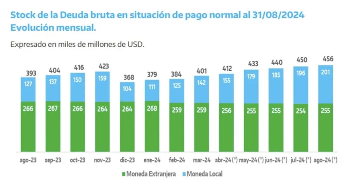 La deuda en situación de pago normal ascendió a la cifra record de US$ 455.935 millones en agosto, lo que representó un aumento de US$ 6.318 millones respecto a julio, informó la secretaría de Finanzas-
